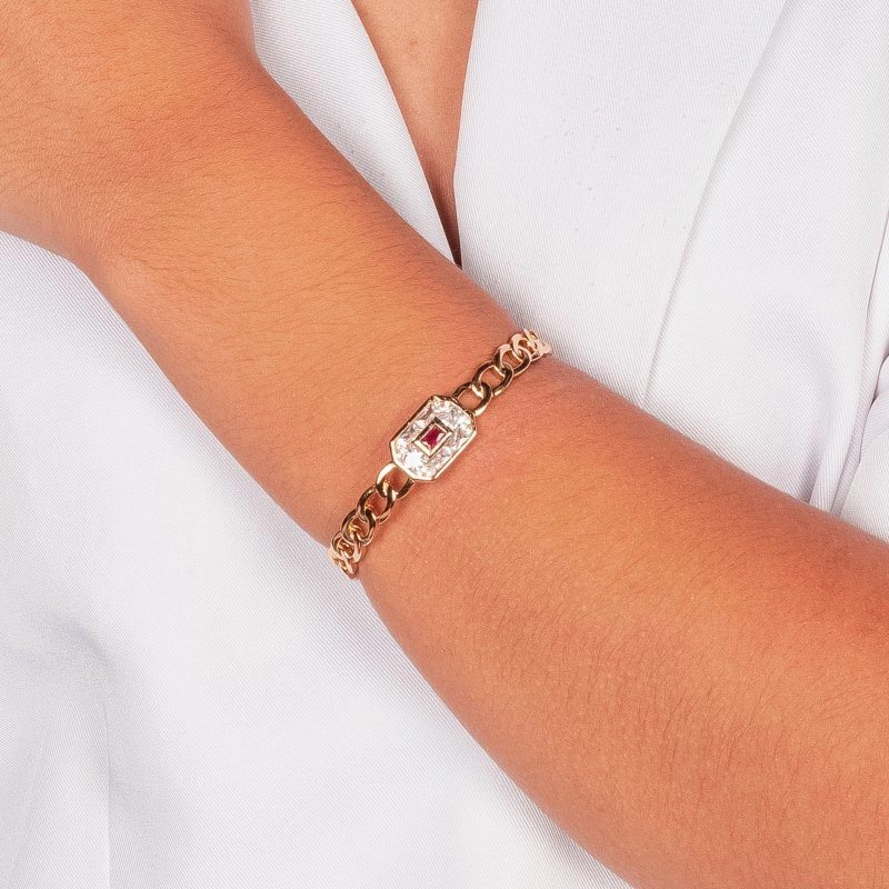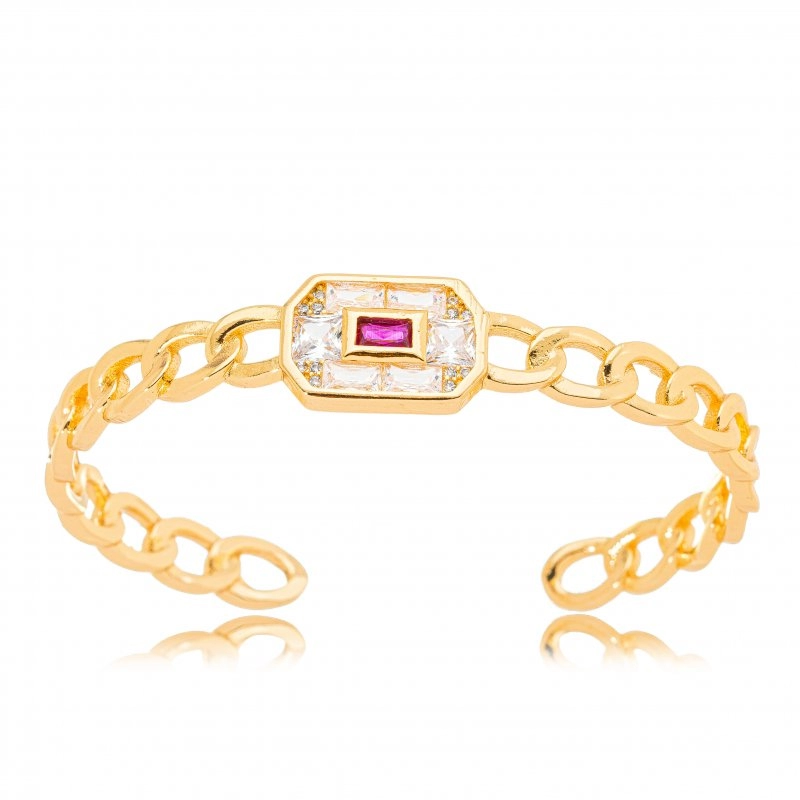 Semijoia Gazin- Bracelete Aro Corrente Cristal Rubi Confeccionado em Banho de Ouro Amarelo de 18k.