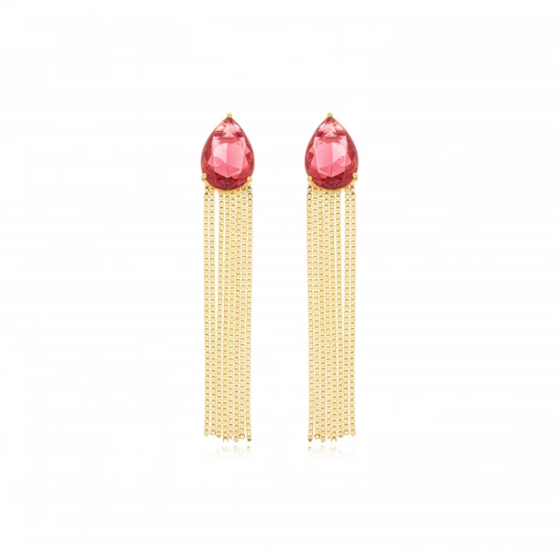 Semijoia Gazin - Brinco Gota Franja Cristal Confeccionado em Banho de Ouro Amarelo 18K.