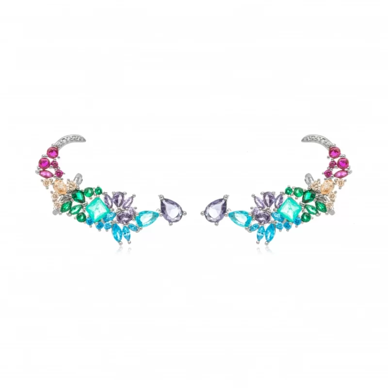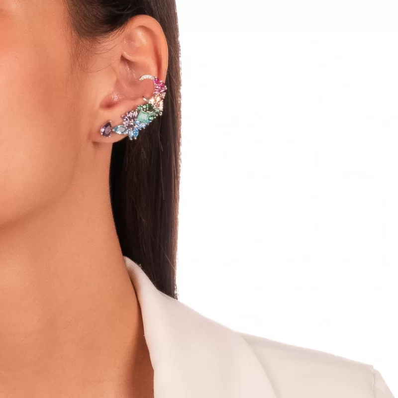 Semijoia Gazin - Brinco Ear Cuff Flores Color Confeccionado em Banho de Ródio Branco.