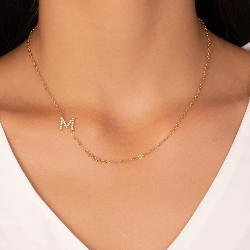 Semijoia Gazin- Colar Letra M Zircônia Confeccionado em Banho de Ouro 18K.