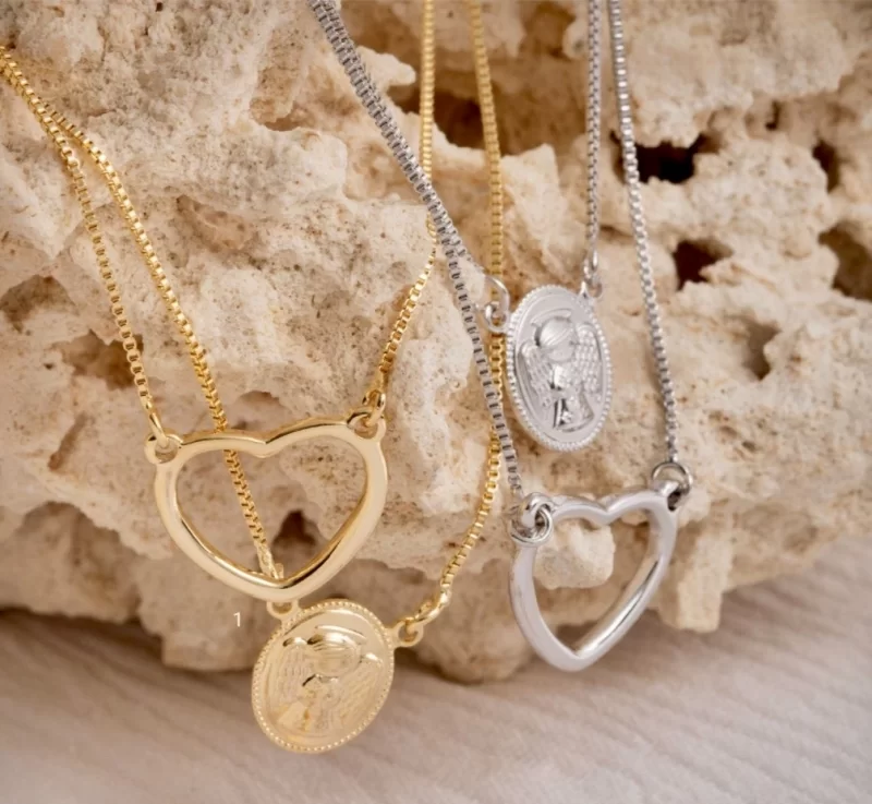 Colar Escapulário Coração e Anjo Confeccionado em Banho de Ouro Amarelo de 18k.