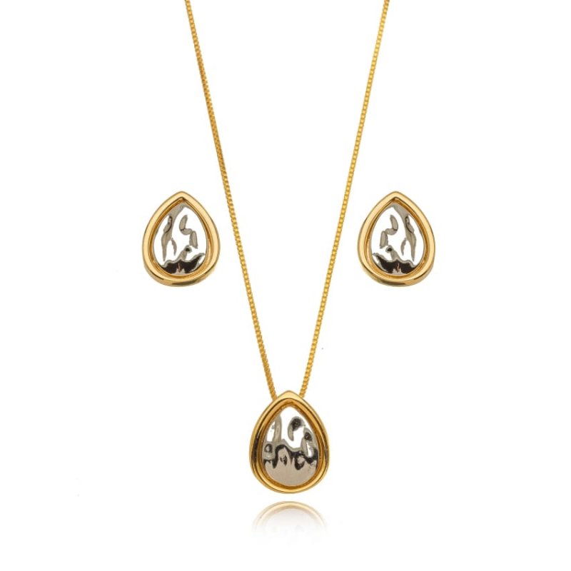 Conjunto Gota Liso Bicolor Confeccionada em Banho de Ouro Amarelo 18k e Ródio Branco.