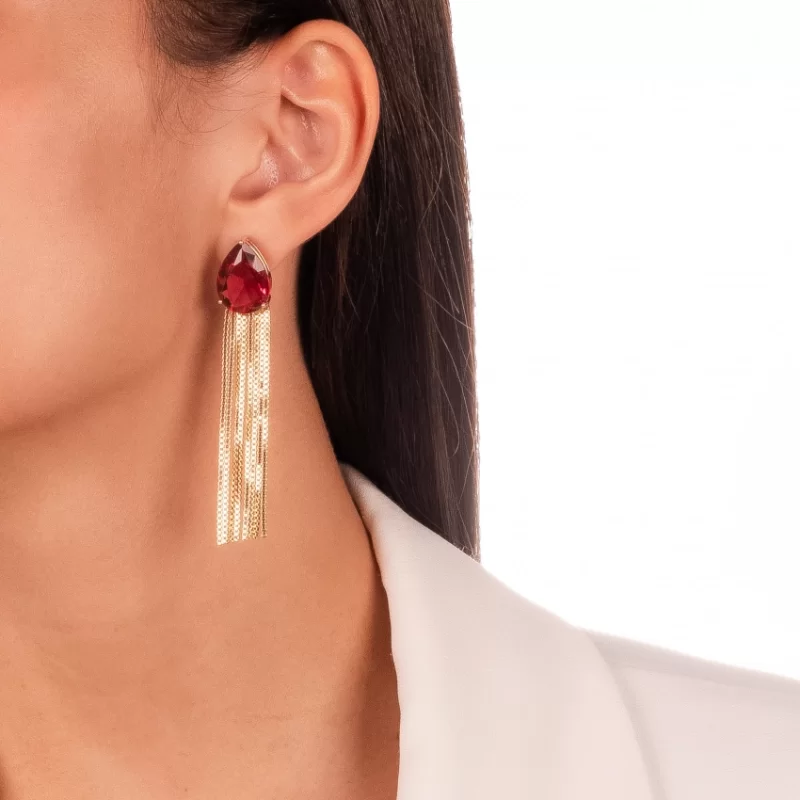 Semijoia Gazin - Brinco Gota Franja Cristal Confeccionado em Banho de Ouro Amarelo 18K.