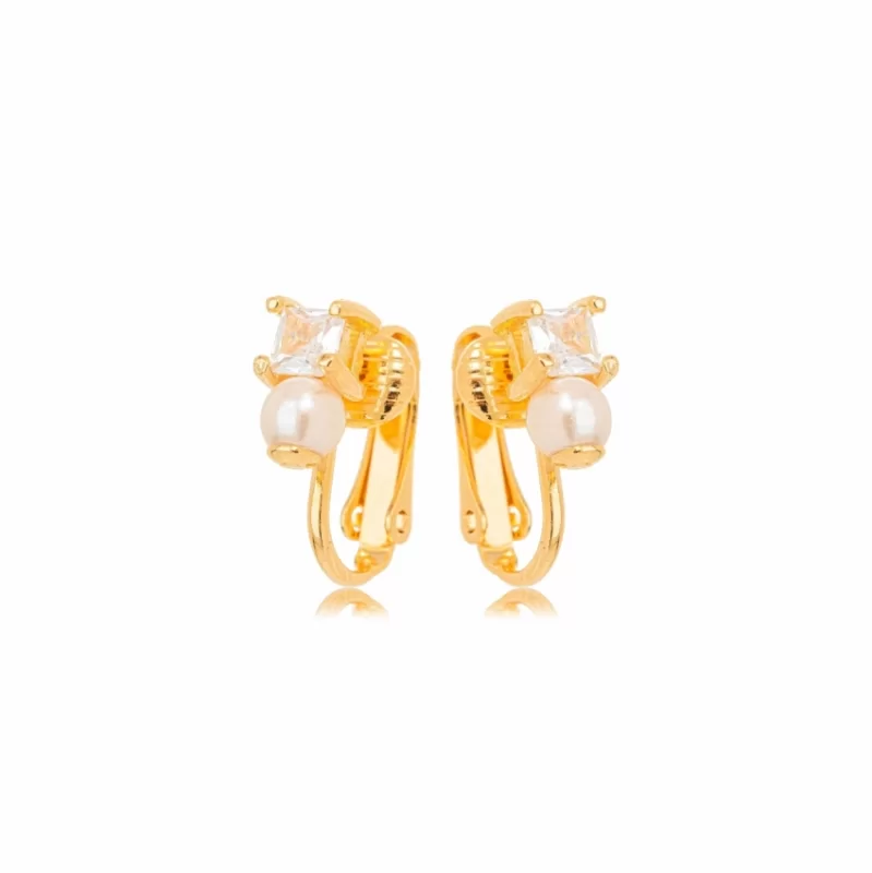 Semijoia Gazin- Brinco de Pressão Cristal e Pérola Confeccionado em Banho de Ouro Amarelo de 18K.