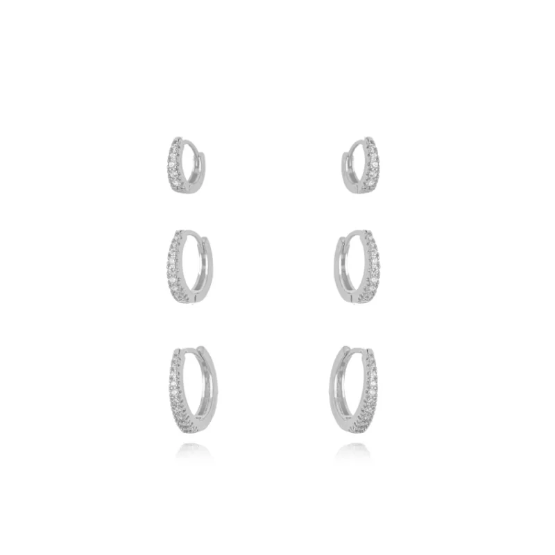 Brinco Trio Argola Micro Zircônia Confeccionado em Banho de Ródio Branco