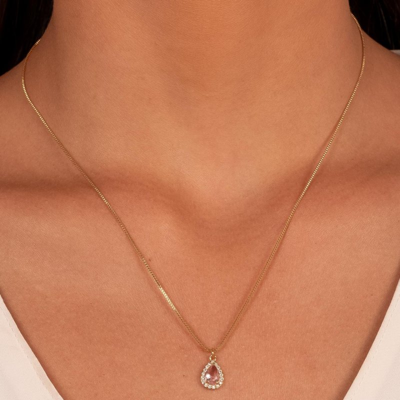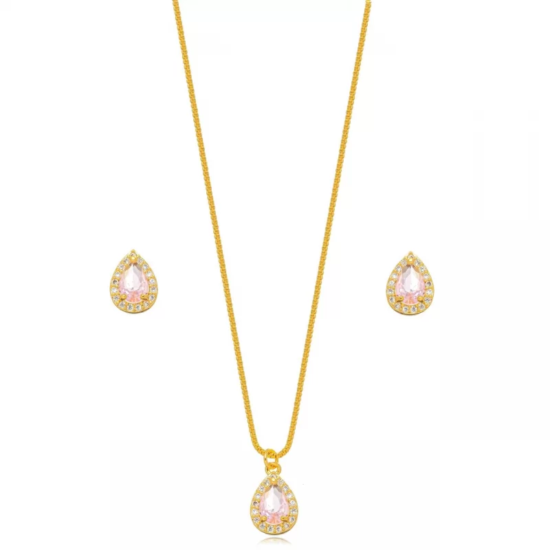 Conjunto Gota Cravejado Rosa Confeccionado em Banho de Ouro Amarelo 18K.