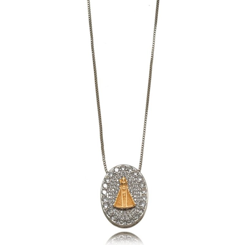 Colar Nossa Senhora Micro Zircônia Bicolor Confeccionado em Banho de Ouro Amarelo 18k e Ródio Branco.