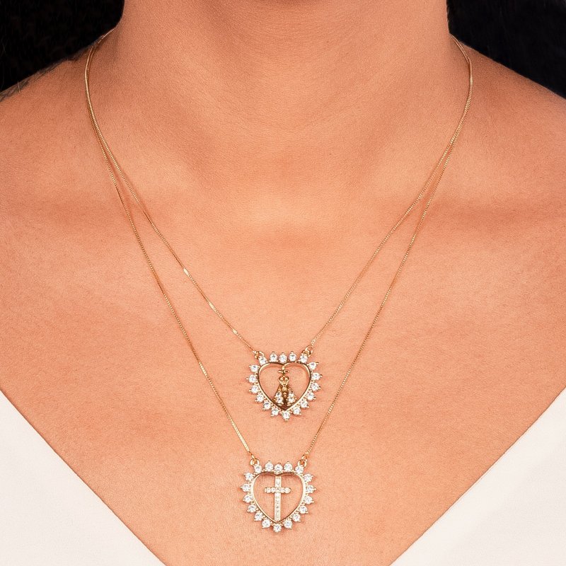 Colar Duplo Cruz Nossa Senhora Confeccionado em Banho de Ouro Amarelo de 18K.